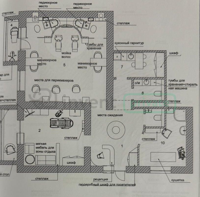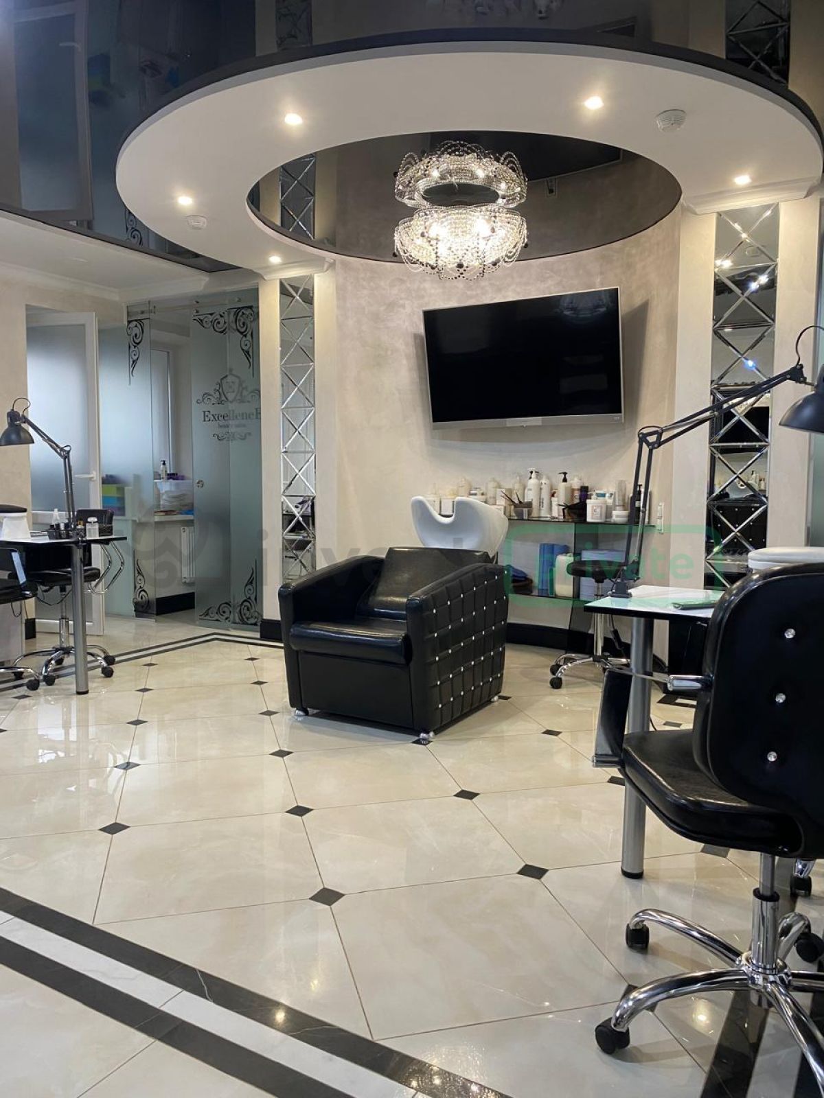 Действующий салон красоты с оборудованными рабочими местами для парикмахеров, косметологов, массажистов и мастеров маникюра. Всего 14 рабочих мест.