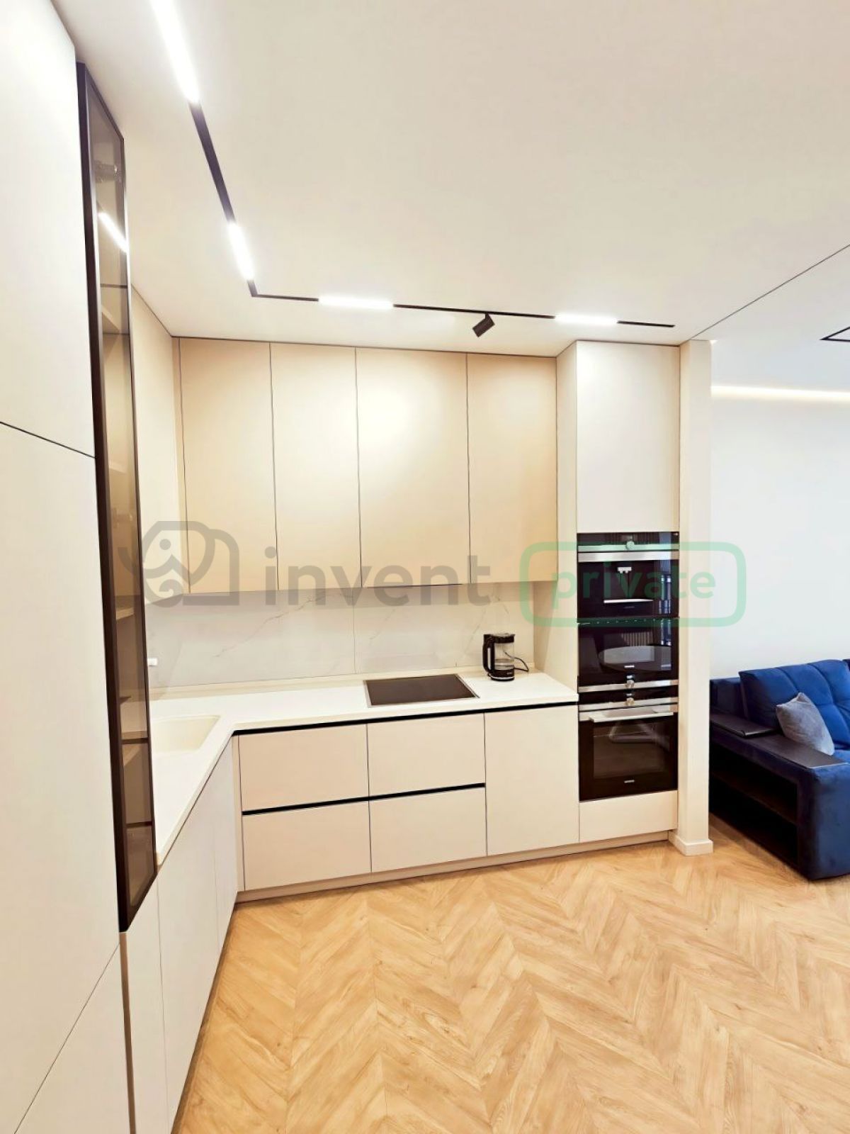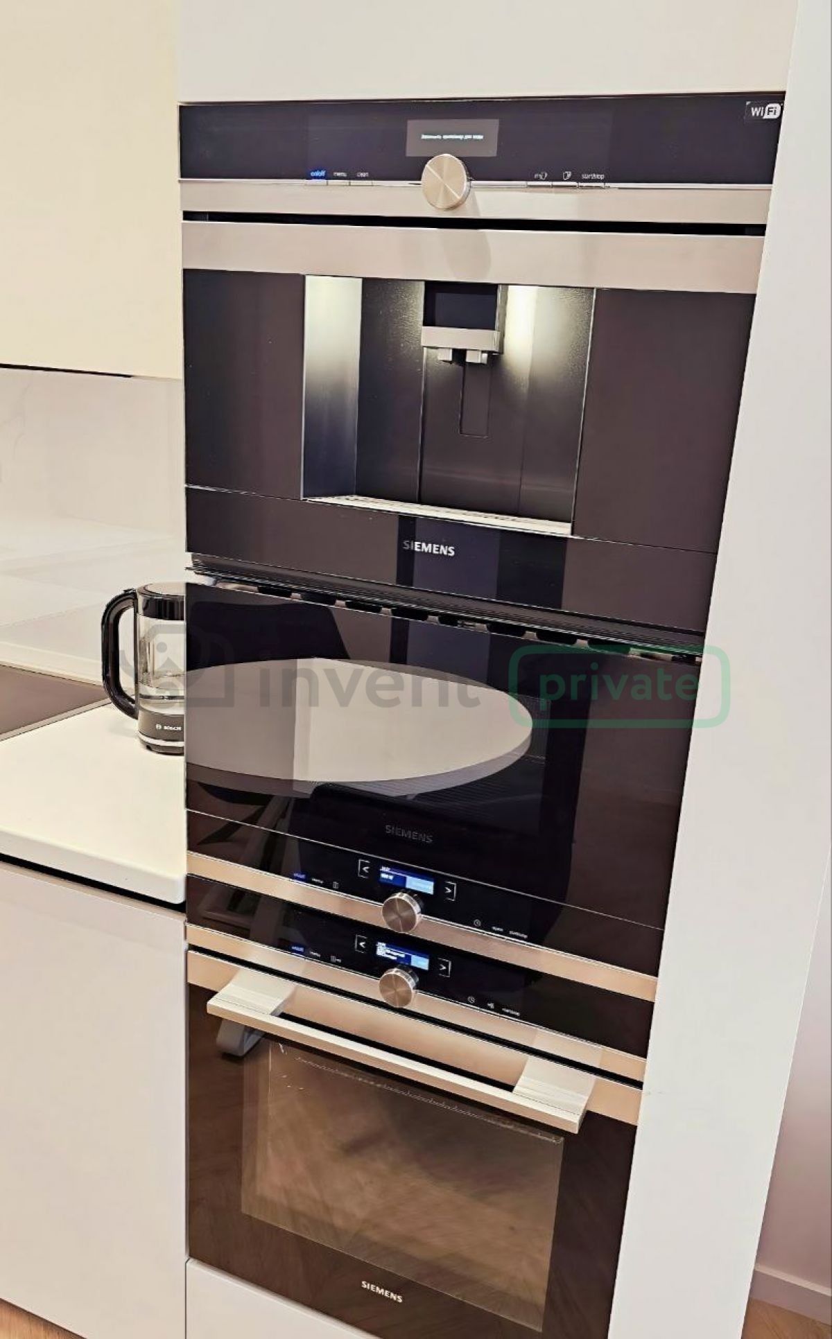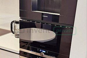 Бытовая техника: кофемашина, духовка, микроволновка, индукционная плита, посудомоечная машина, холодильник Bosch, стирально-сушильная машина, телевизор Samsung, вертикальный пылесос.