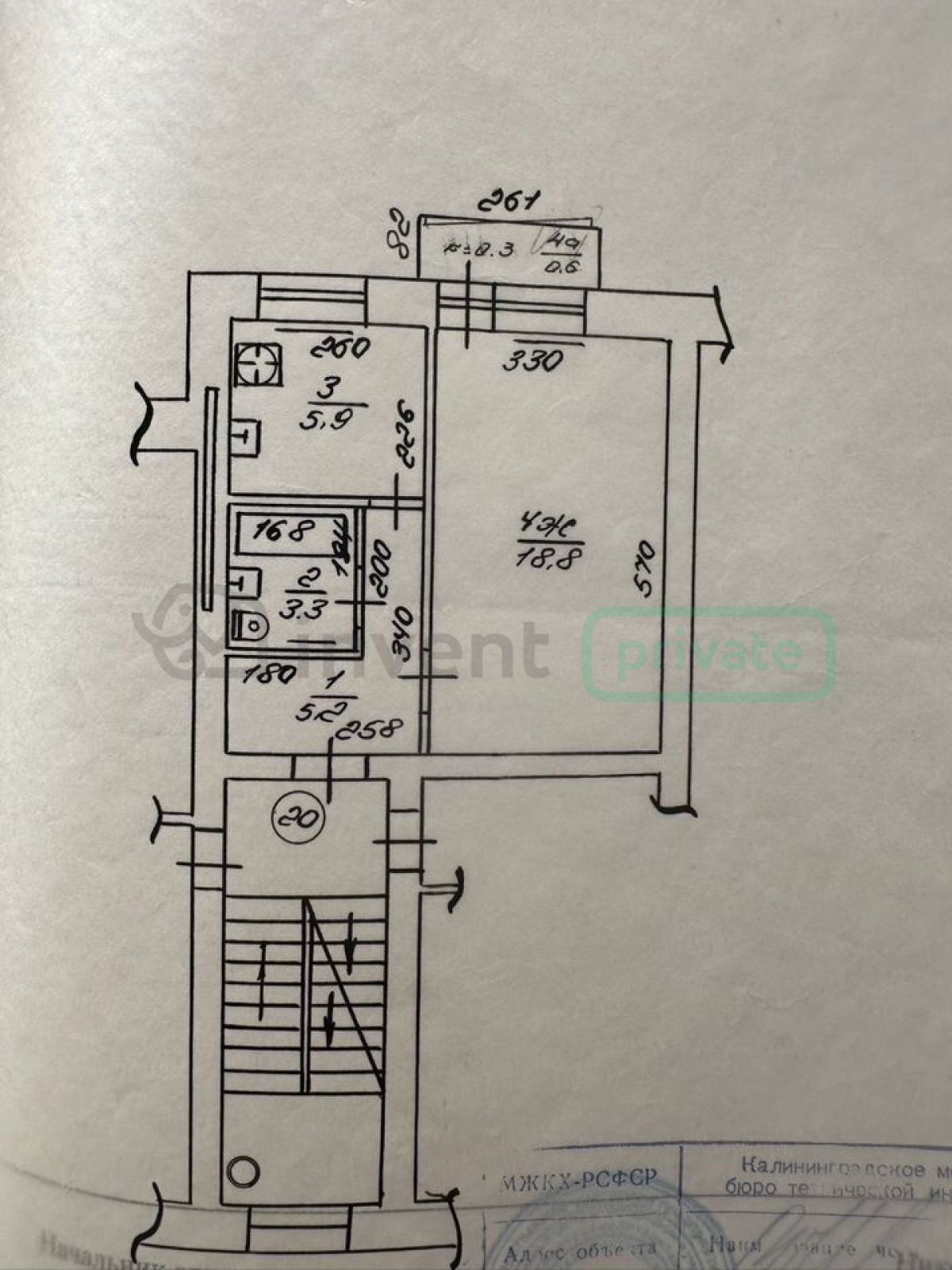 Общая площадь — 34 кв. м, жилая — 19 кв. м, кухня — 6 кв. м.