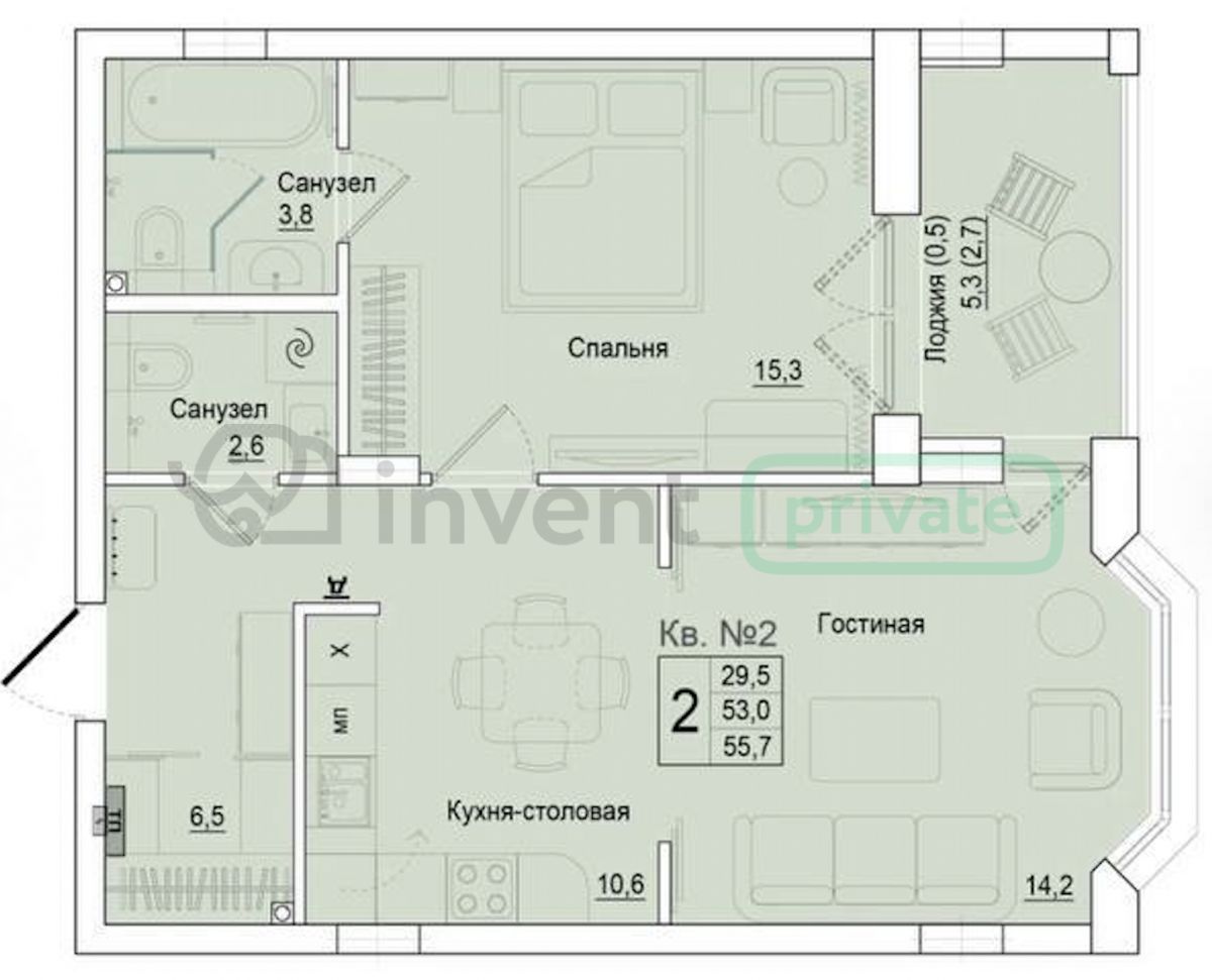 - Общая площадь — 55,7 м²