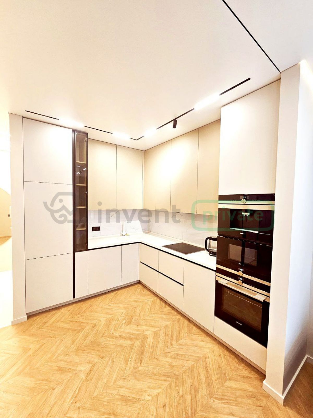 Бытовая техника: кофемашина, духовка, микроволновка, индукционная плита, посудомоечная машина, холодильник Bosch, стирально-сушильная машина, телевизор Samsung, вертикальный пылесос.