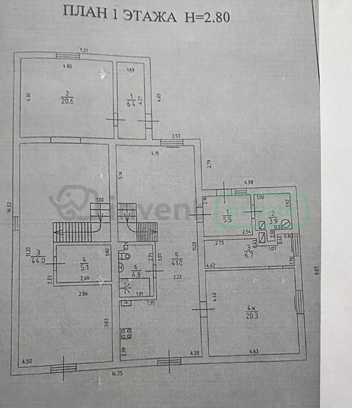 Первый этаж: просторная и светлая кухня-гостиная 44м², удобная кухня-столовая - 41м², два санузела 4,8 и 5 кв м, гардероб 6,7 кв м, комната 20,3 кв м.