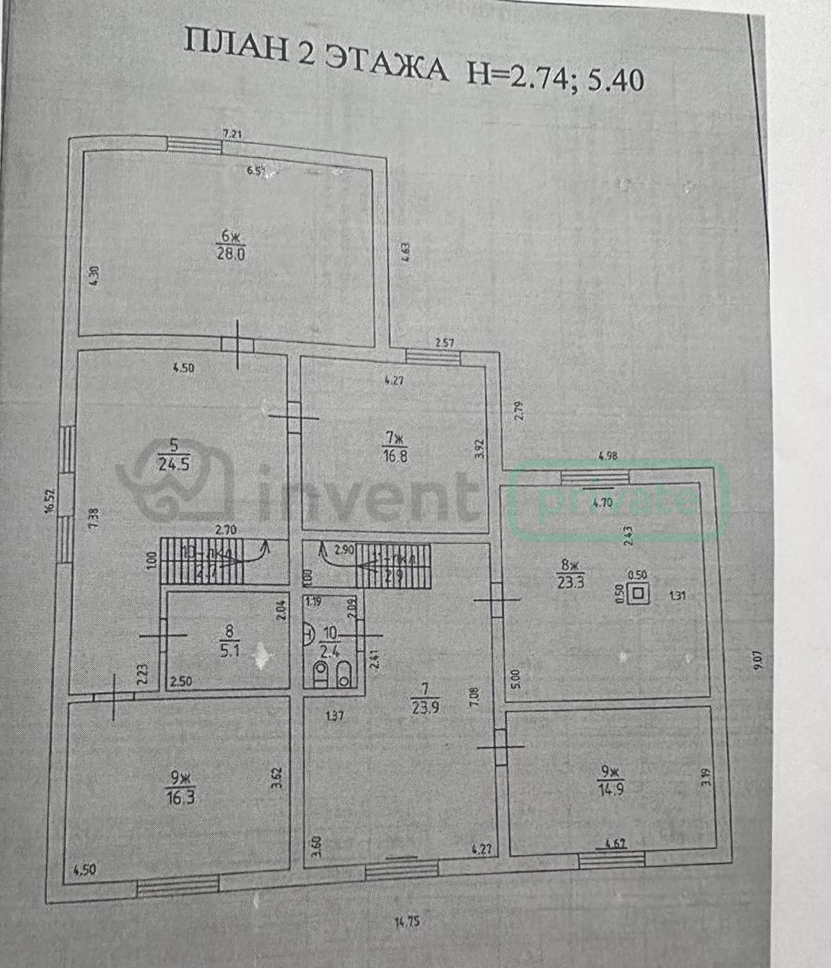 Второй этаж: 5 изолированные комнaты: 28; 16,8; 23,3; 14,9; 16,3 м² комнаты соединены двумя гостиными комнатами 24,5 и 23,9 кв м, 2 санузела площадью 2,4; 5,1 м².