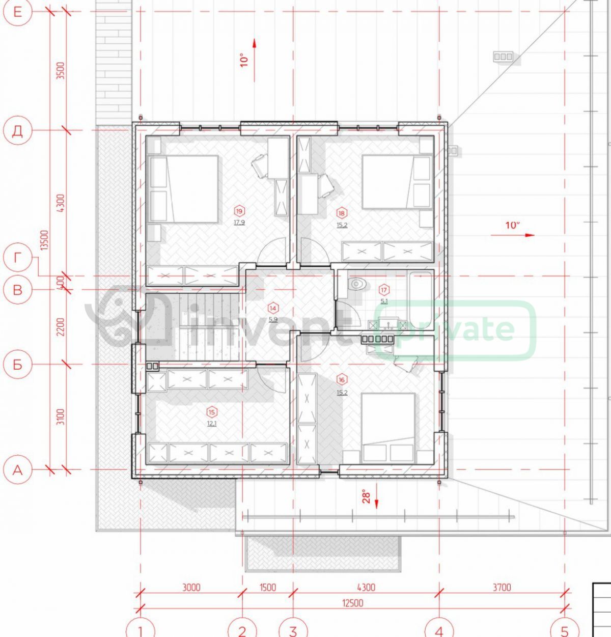 - Личная зона: Три изолированные спальни 17,9 кв.м, 15,2 кв.м и 15,2 кв.м.