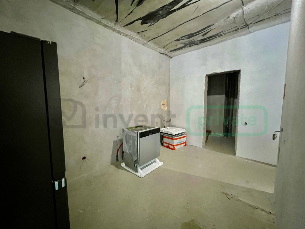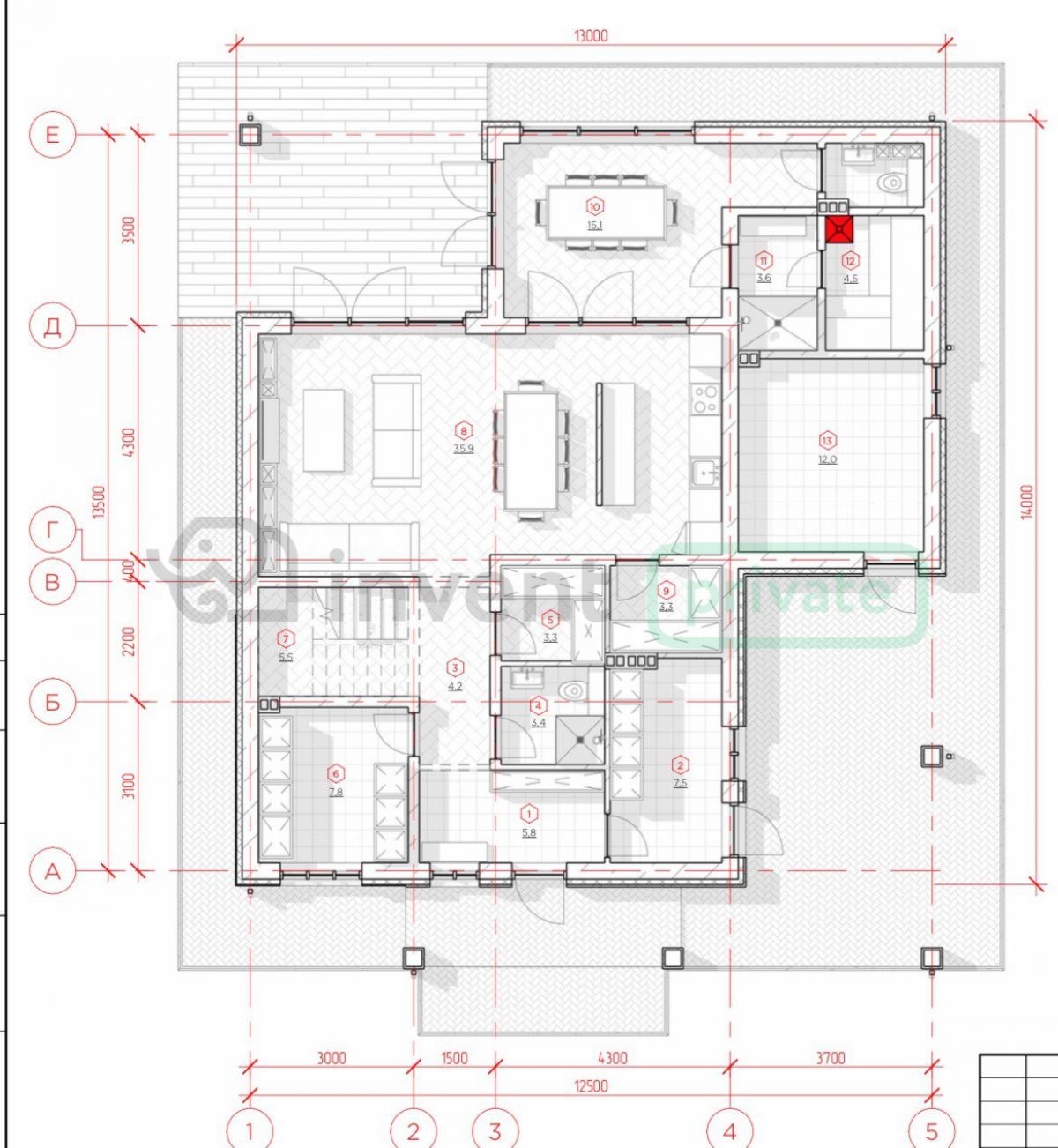 - Общественная зона: Просторная кухня-гостиная 35,9 кв.м, разделенная перегородкой. Есть кухонная кладовая 3,3 кв.м