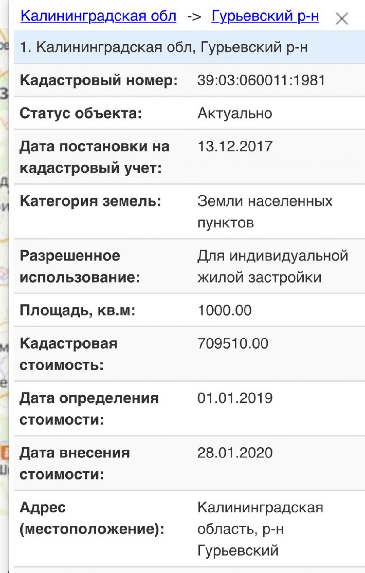 | Кадастровый номер участка | 39:03:060011:1981 |